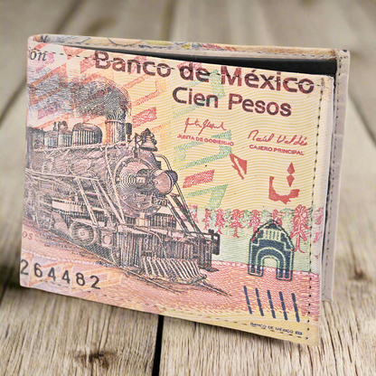Leather wallet for men with Cien Pesos / 100 Pesos print. Made in Mexico.