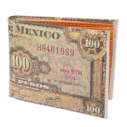 Cartera de piel para hombre con impresion de Cien Pesos / 100 Pesos. Hecho en Mexico.