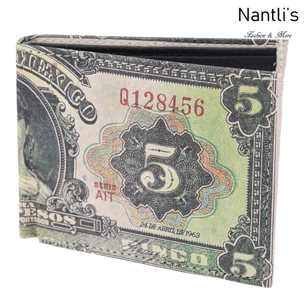 Cartera de piel para hombre con impresion de Cinco Pesos / 5 Pesos. Hecho en Mexico.