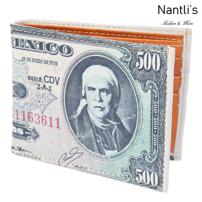 Cartera de piel para hombre con impresion de Quinientos Pesos / 500 Pesos. Hecho en Mexico.