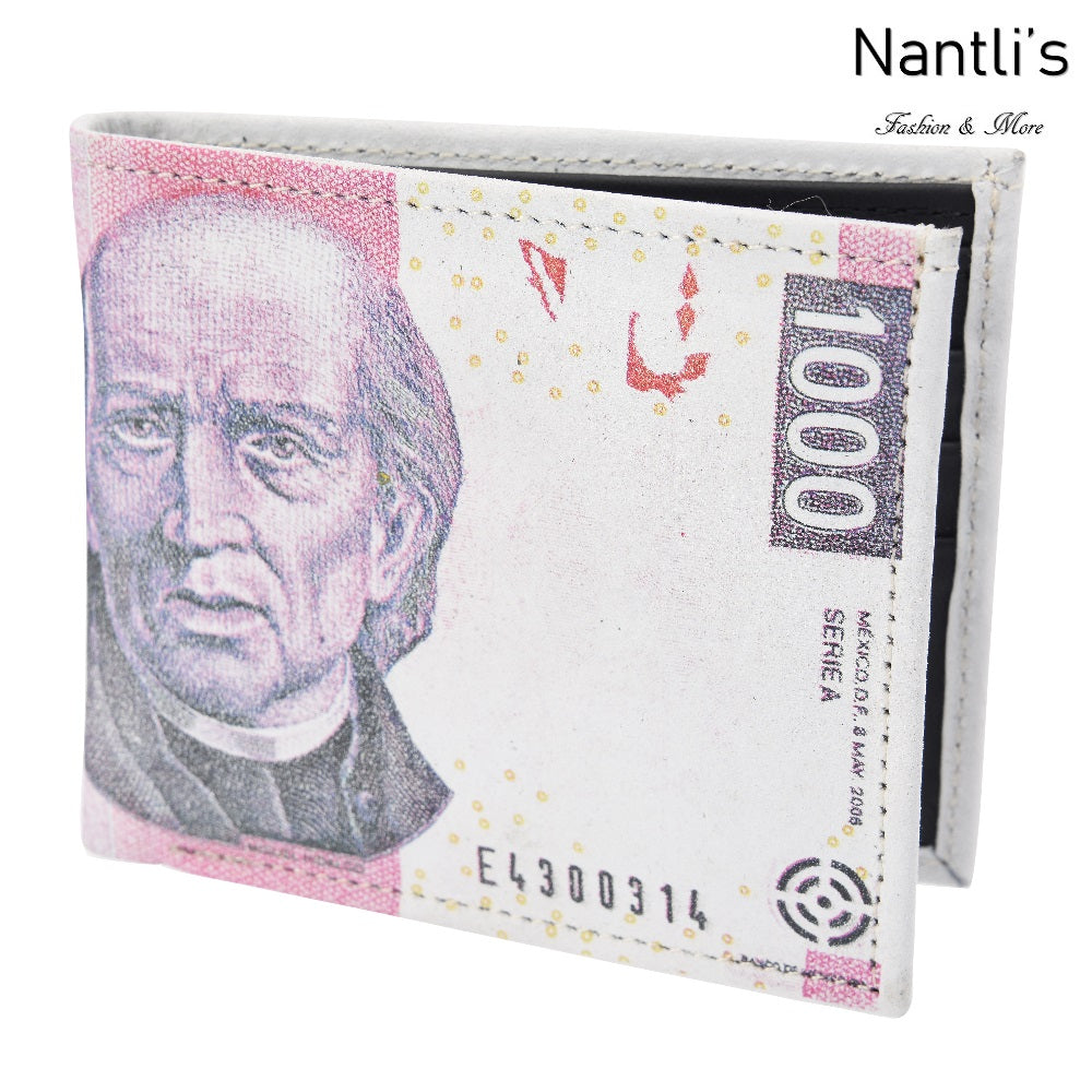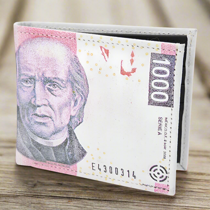 Cartera de piel para hombre con impresion de Mil Pesos / 1000 Pesos. Hecho en Mexico.