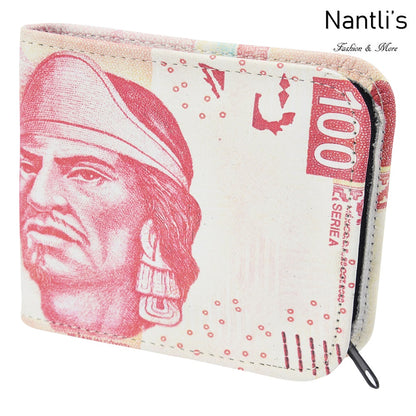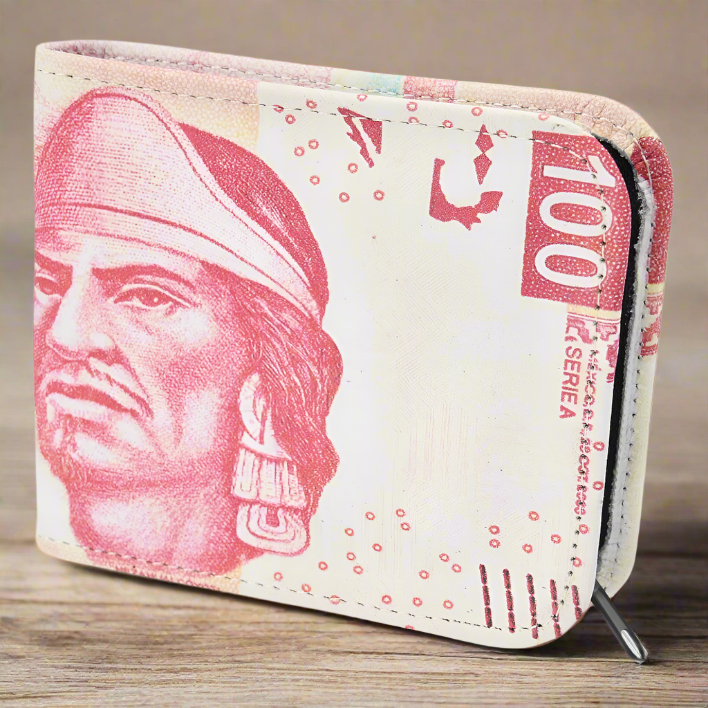 Cartera de piel con cierre, con impresion de Cien Pesos / 100 Pesos. Hecho en Mexico.