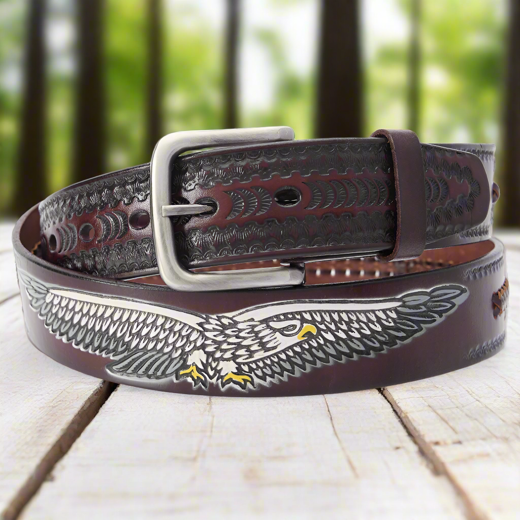 Modern leather belt with woven designs and engraved. This fine western belt works with both casual and dress look, for men and women. Made in Mexico.