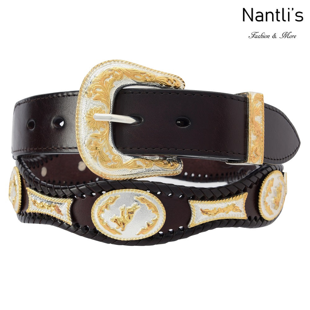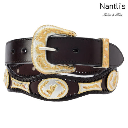 Cinto moderno de piel con diseños tejidos y adornado con conchos o chapetones de metal y hebilla fina grabada. Este cinturon vaquero funciona con ropa casual y de vestir, tanto para hombre como para mujer. Hecho en Mexico.