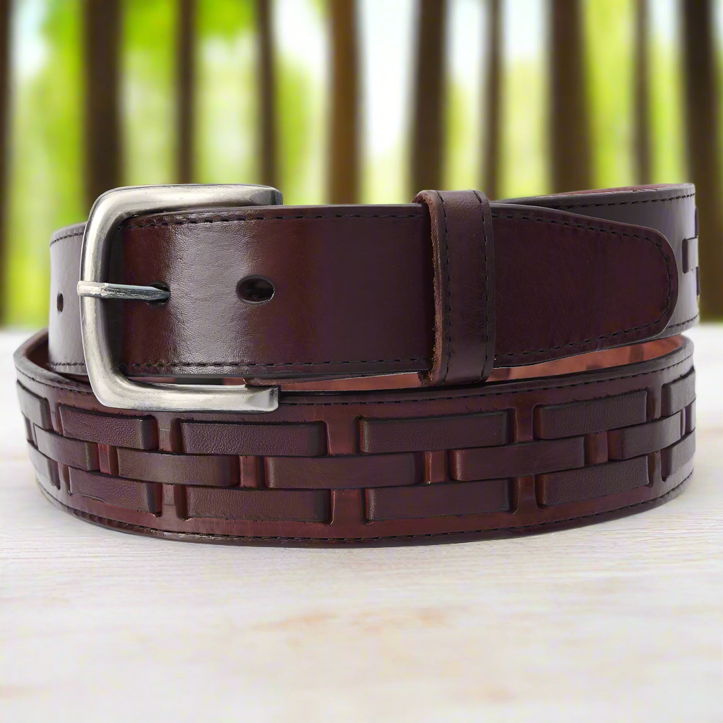 Modern leather belt with woven designs. This fine western belt works with both casual and dress look, for men and women. Made in Mexico.