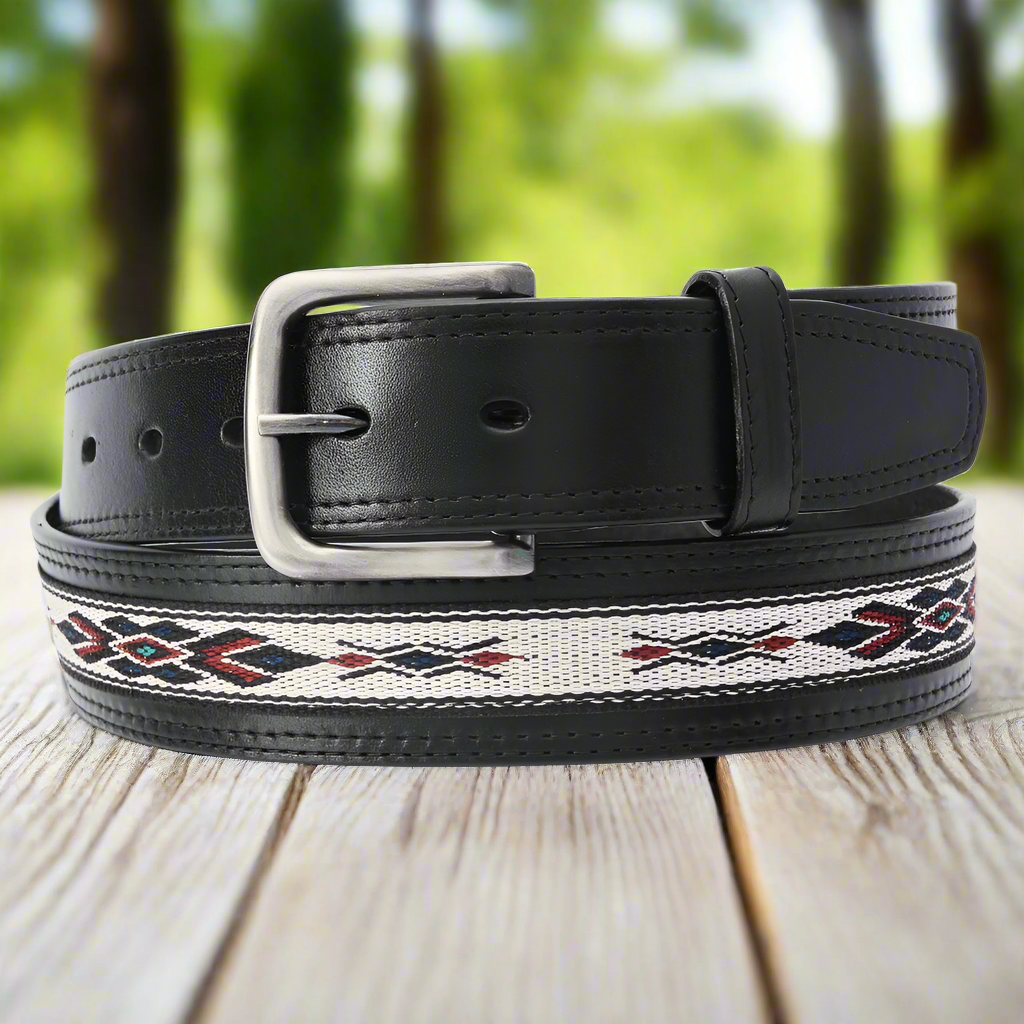 Modern leather belt with fabric designs. This fine western belt works with both casual and dress look, for men and women. Made in Mexico.