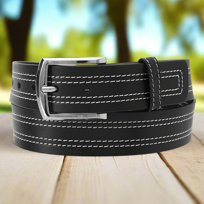 Cinto de piel adornado con costuras. Este cinturon funciona con ropa casual y de vestir. Hecho en Mexico.