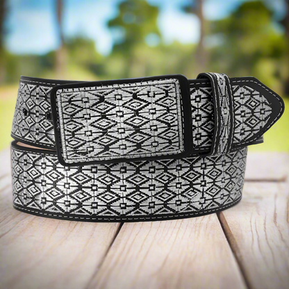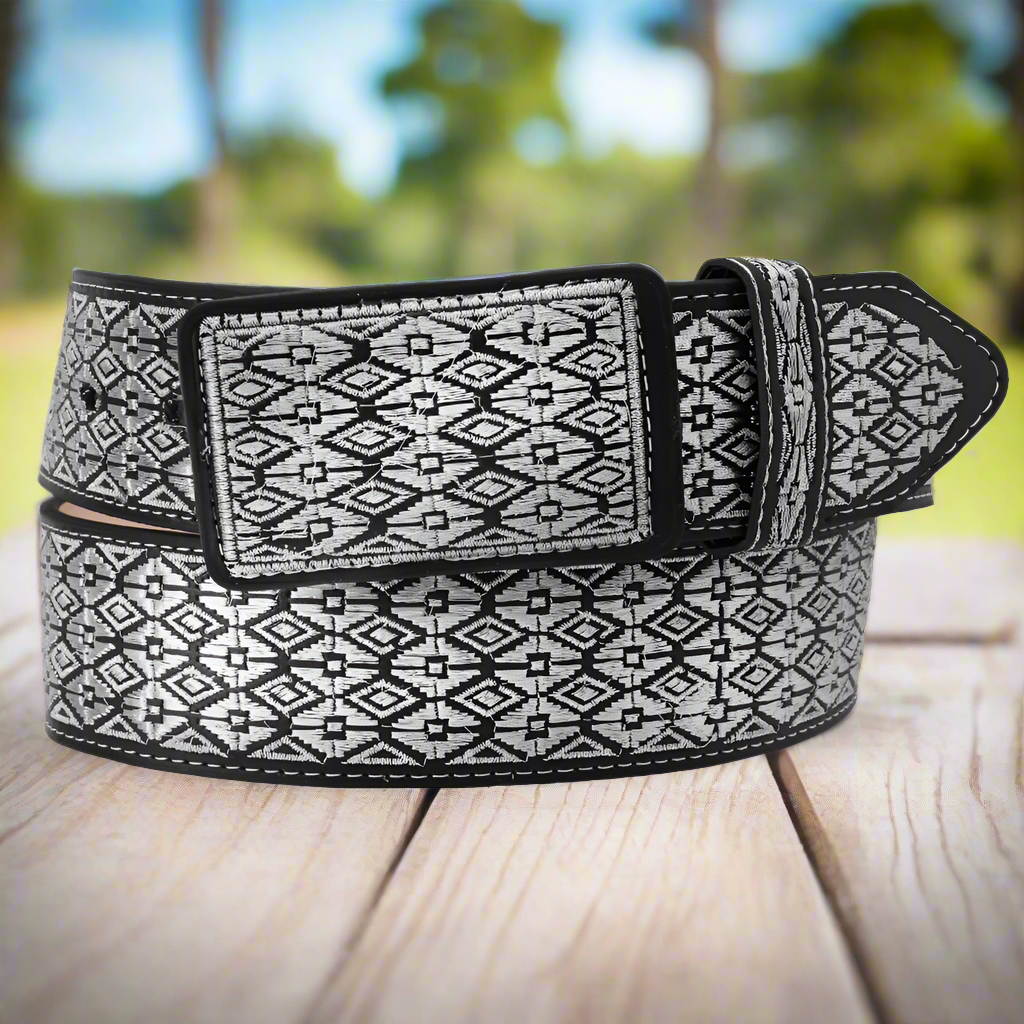 Cinto de piel con diseños bordados con hilo metalico. Este cinturon vaquero funciona con ropa casual, vaquera o para trajes charros y atuendos de mariachi, tanto para hombre como para mujer. Hecho en Mexico.