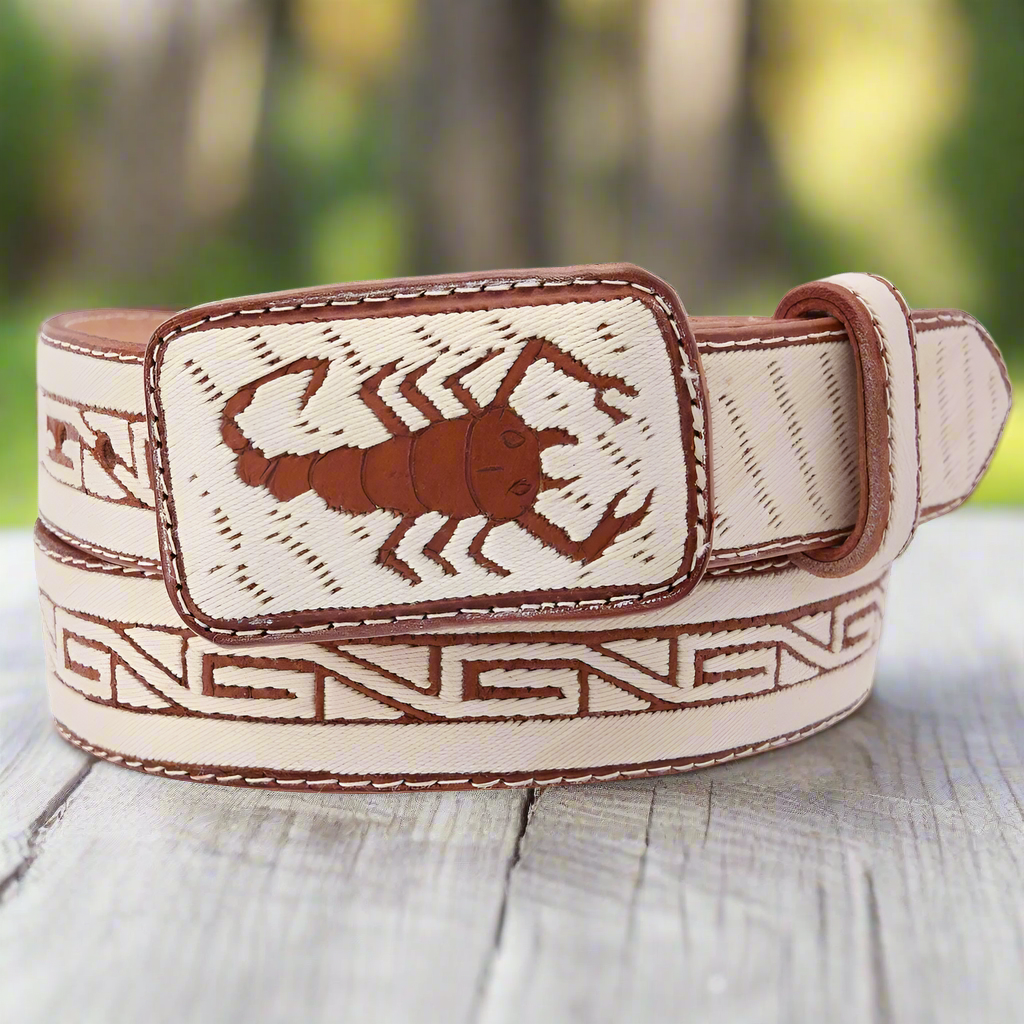 Cinto de piel con diseños bordados. Este cinturon vaquero funciona con ropa casual, vaquera o para trajes charros y atuendos de mariachi, tanto para hombre como para mujer. Hecho en Mexico.