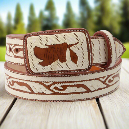 Cinto de piel con diseños bordados. Este cinturon vaquero funciona con ropa casual, vaquera o para trajes charros y atuendos de mariachi, tanto para hombre como para mujer. Hecho en Mexico.