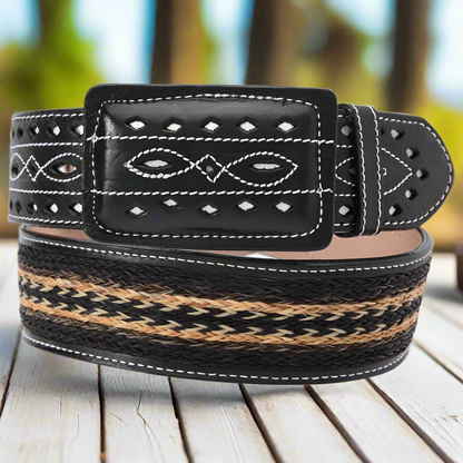 Cinto de piel con diseños y adornado con crines de caballo (Pelo de caballo). Este cinturon charro funciona con ropa casual, look vaquero o para trajes charros y atuendos de mariachi, tanto para hombre como para mujer. Hecho en Mexico.
